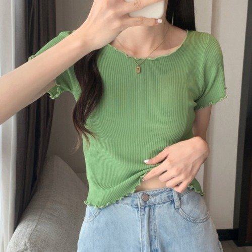 针织女装设计大木耳边款丝胖感衫短L款码薄mm女修身冰t恤夏季短袖热门设计联盟服务商
